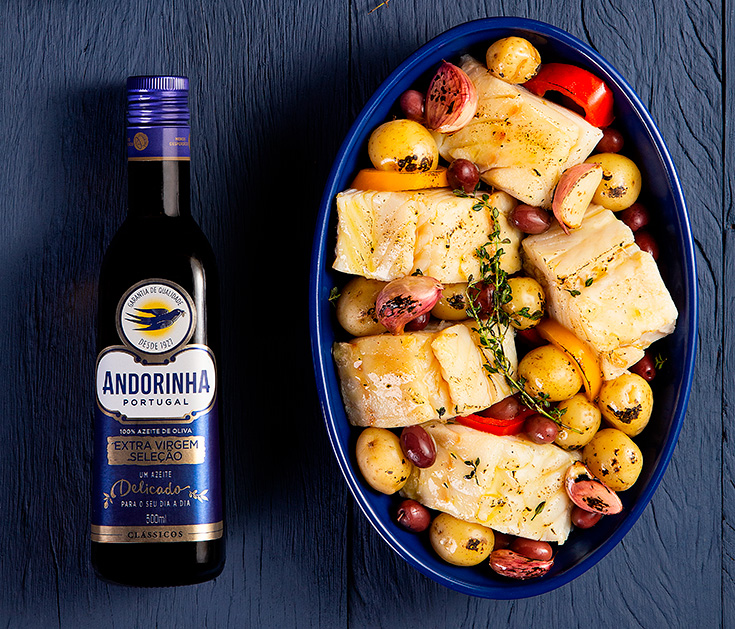 - Tempere com sal e pimenta do reino a gosto se sentir necessidade. Junte os ramos de tomilho, regue com o restante do Azeite Andorinha Extra Virgem Seleção e leve ao forno para assar por 30 minutos.
