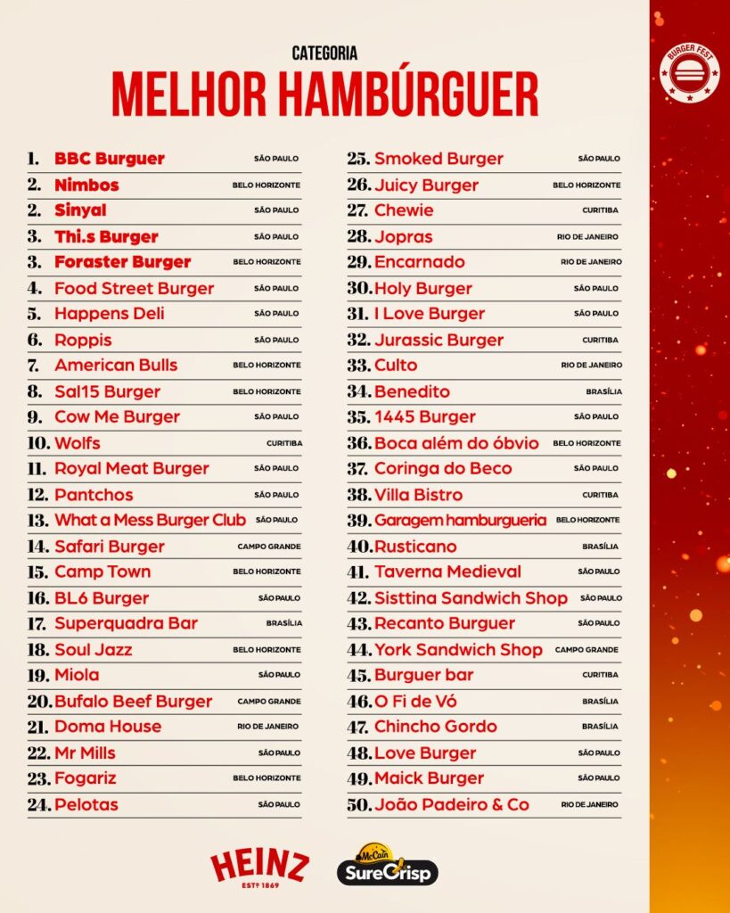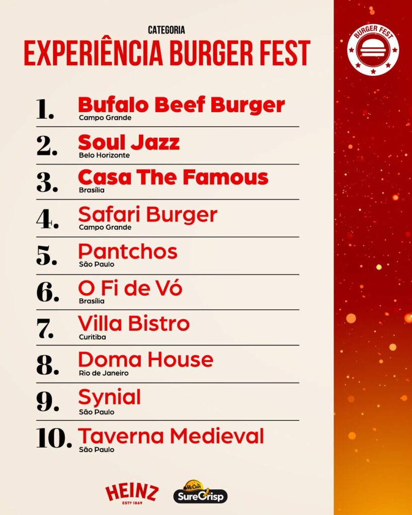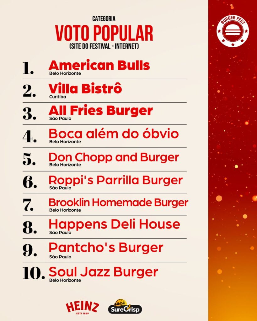 Na categoria Engajamento, o restaurante Roppis figurou em terceiro lugar, enquanto na categoria Voto Popular, decidida pelos consumidores no site oficial do evento, o All Fries Burger conquistou a terceira posição. Casas de Belo Horizonte, Rio de Janeiro, Brasília e Curitiba também se destacaram nesta edição do ranking Burger Fest.