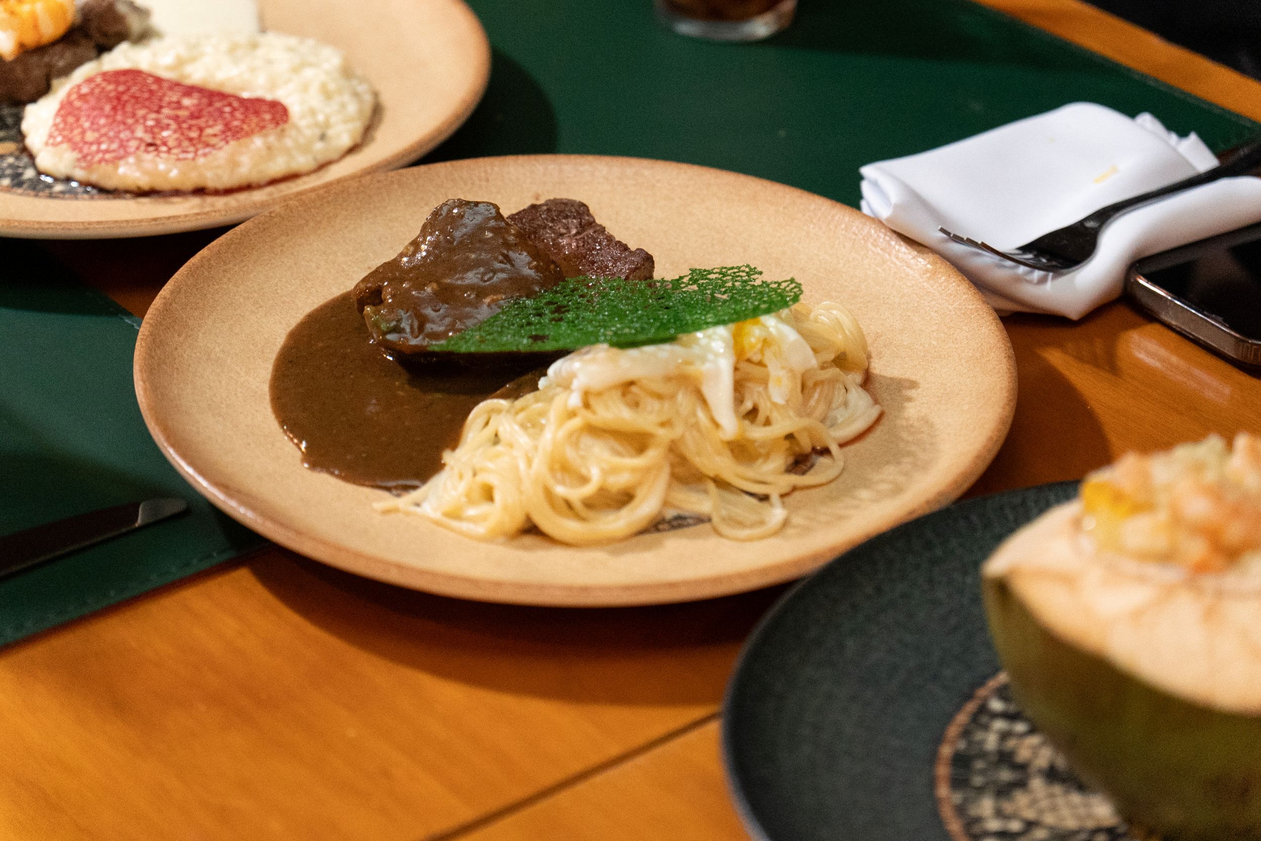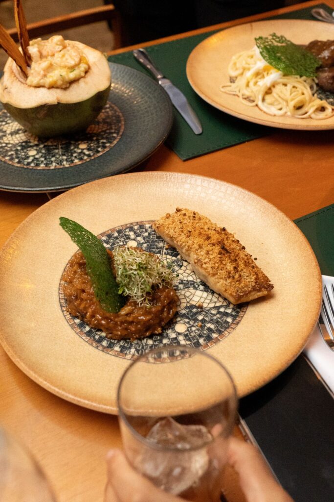 Para transformar essa visão em realidade, a dupla convidou o chef Antônio Santos, com mais de 20 anos de carreira, para assinar as criações da casa. O resultado é um menu autoral, criativo e surpreendente, em que ingredientes como cajuzinho, baru, banana-da-terra, melaço, framboesa e manga aparecem em releituras modernas de clássicos internacionais e brasileiros. Alguns insumos dão o tom da proposta: uma cozinha que valoriza as raízes, mas com ousadia contemporânea.