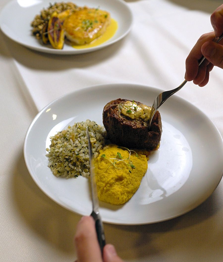 • Filé mignon com manteiga de cogumelos ianomâmi, purê de pupunha e arroz de castanha-do-pará