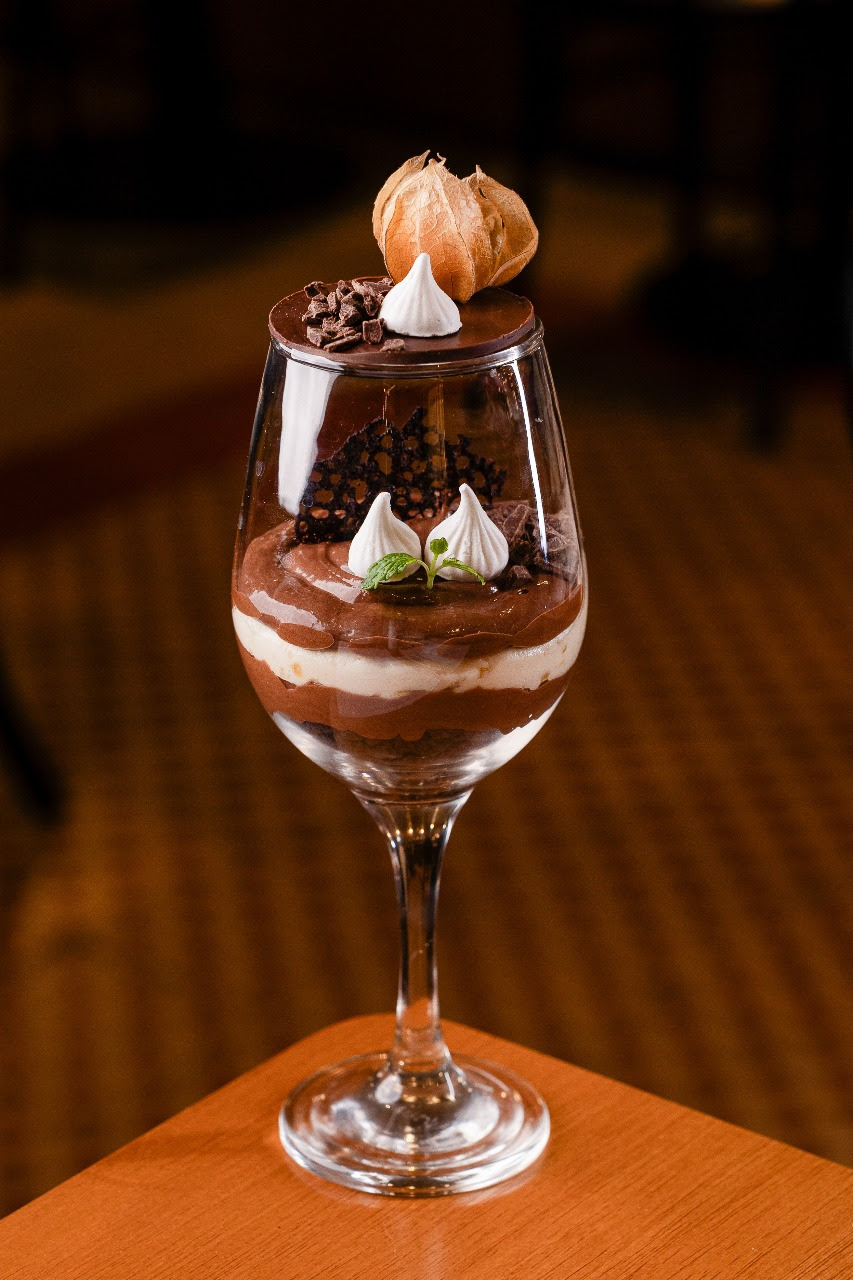 Sofisticada e deliciosa, a Verrine des Secrets, feita com café e laranja, é servida em camadas dispostas em um copo transparente. O toque final é dado por uma fina crosta de chocolate, posicionada estrategicamente no topo do copo, e delicadamente decorada com uma physalis. O resultado traz um visual exuberante, que permite a apreciação das diferentes camadas de sabores e texturas e torna a experiência degustativa ainda mais especial.