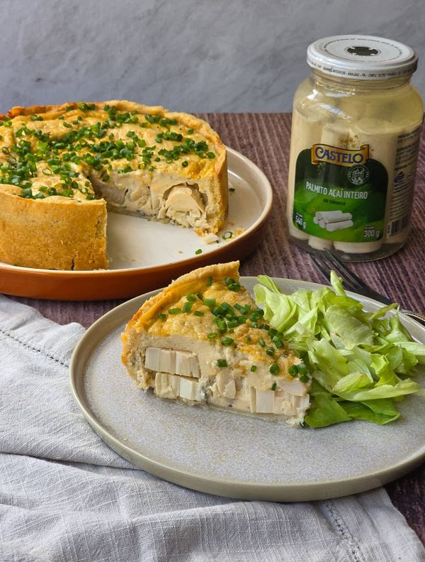 Coloque no processador a farinha de trigo, a manteiga gelada, o sal, o ovo e a água gelada e triture até formar uma massa homogênea. Forre com essa massa o fundo e as laterais de uma forma de fundo removível de 22cm de diâmetro. Cubra a massa com papel manteiga, distribua cerca de 300g de grãos secos para fazer peso e leve ao forno preaquecido a 200 °C por 20 minutos. Retire do forno, descarte o papel e os grãos e reserve. Escorra o Palmito Açaí Inteiro Castelo e corte-o em fatias. Em uma tigela, bata os ovos com o creme de leite e tempere com noz-moscada, sal e pimenta. Acrescente o queijo gorgonzola. Despeje o creme sobre a massa pré-assada, distribua as fatias de palmito por cima e leve ao forno preaquecido a 180 °C por cerca de 40 minutos, ou até o recheio firmar e dourar levemente. Retire do forno, finalize com cebolinha picada e sirva.