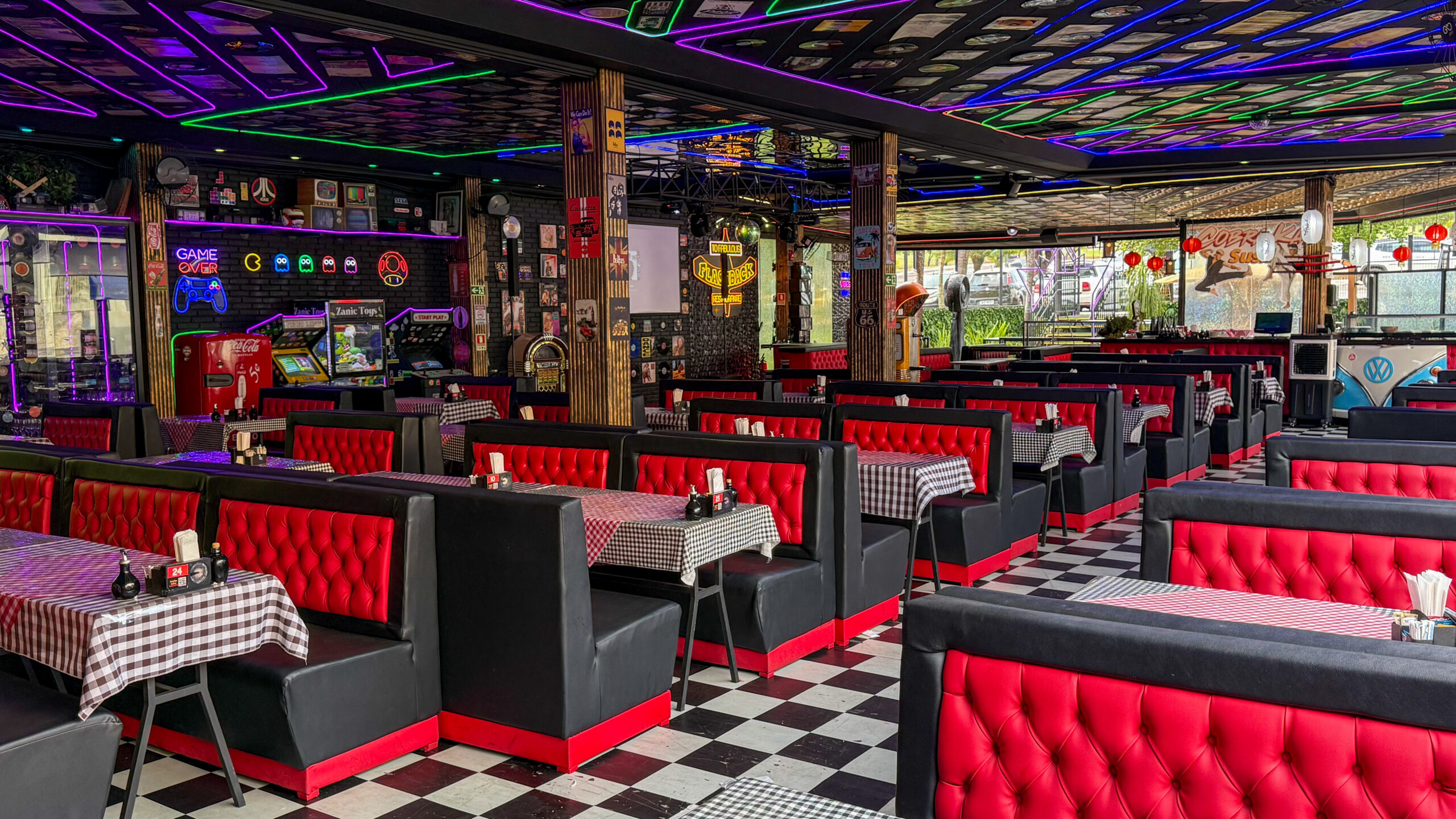 O ambiente é totalmente temático: há pista de dança iluminada, jogo de luzes que transforma o espaço à noite, quadros retrôs de personalidades que marcaram época e até uma bomba de gasolina retrô que serve chope — um símbolo da irreverência e do espírito divertido da casa.